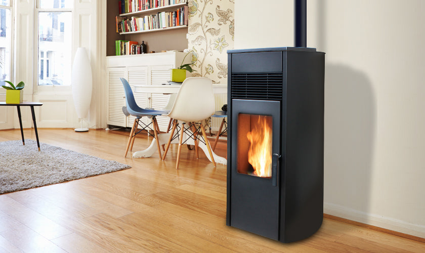 La estufa ROBERTA con salida superior ofrece excelentes soluciones de calefacción gracias a su potencia nominal de 8 kW. Con su forma redondeada y su frontal plano, se integra fácilmente en las estancias. Se ofrece con revestimiento de acero y parte superior de cerámica.